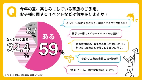 それによると、「今夏、楽しみにしている家庭の予定、子どもに関するイベントなどは何かあるか」と聞いたところ、「ある」が59%、「何となくある」が32.4%、「ない」が8.7%だった。約90%が「楽しみな予定がある」と答えており、内容は「旅行や自然と触れ合う」などの回答が多く、酷暑で日々出かけられない分、イベントでは自然に触れたり、夏らしい体験ができることを重視する傾向が伺えた。