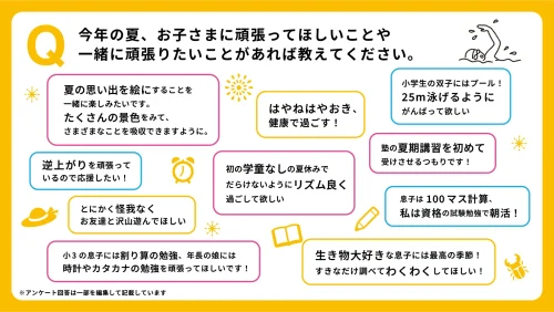 夏休みに「子どもに頑張ってほしいことや、一緒に頑張りたいこと」を聞いたところ、「25m泳げるように頑張って欲しい」「初の学童なしの夏休みでだらけないようにリズム良く過ごして欲しい」「息子は100マス計算、私は資格の試験勉強で朝活!」といった声が寄せられた。日々の小さなチャレンジの先にある「成長」を、大切に見つめている家庭が多いのが伝わってくる。