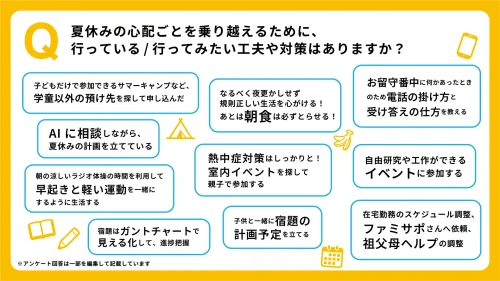 「夏休みの心配ごとを乗り越えるために、行っている/行ってみたい工夫や対策はあるか」と尋ねたところ、「酷暑で日中遊ぶ場所がない」「生活リズムの乱れ」を気にする中、子どもが夏休みを楽しく過ごせるような場所の確保やプランの作成、正しい生活リズムで過ごすための工夫や対策が多く見られた。具体的には、「早起きと運動」や「夏休みや宿題を計画的に」などといった声が寄せられた。