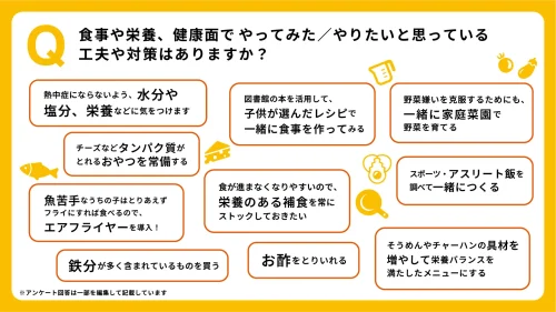また、「食事や栄養、健康面で、やってみた/やりたいと思っている工夫や対策」を聞いたところ、「子どもと一緒にレシピ選びから食事づくりを楽しむ」や「いつものメニューの具材を増やす」「タンパク質を意識したおやつを常備する」といった声が寄せられた。