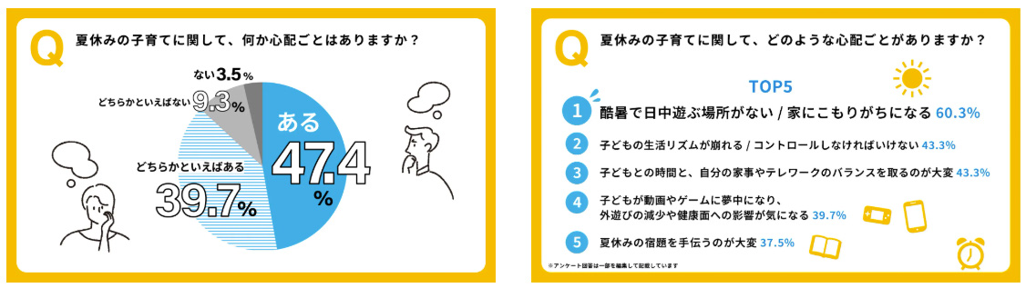 また、「夏休みの子育てに関して、何か心配なことはあるか」と聞いたところ、「ある」が47.4%、「どちらかと言えばある」が39.7%、「どちらかと言えばない」が9.3%、「ない」が3.5%という結果になり、80%以上の親が夏休みの子育てに「心配ごと」を抱えていることが判明。猛暑や学童卒業による居場所に関することなど、現代ならではの声が多く寄せられた。