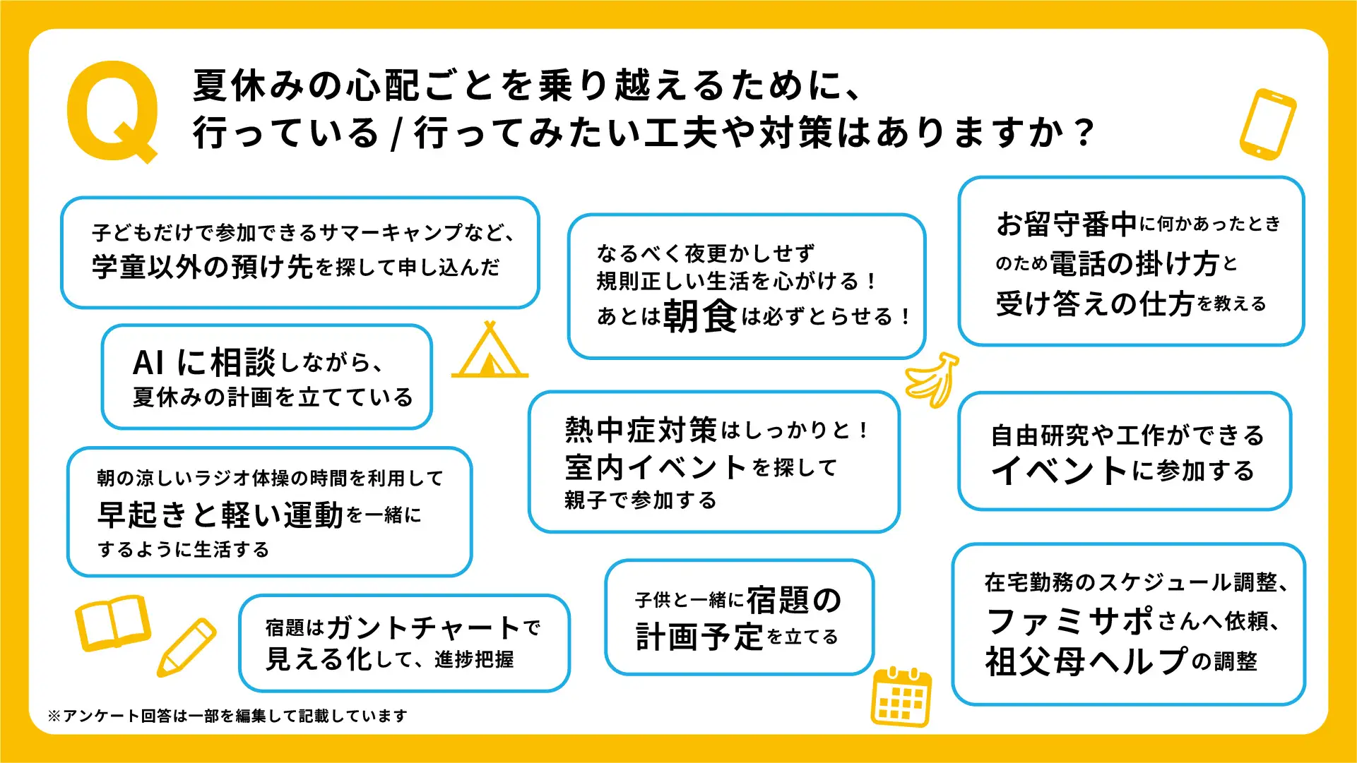 「夏休みの心配ごとを乗り越えるために、行っている/行ってみたい工夫や対策はあるか」と尋ねたところ、「酷暑で日中遊ぶ場所がない」「生活リズムの乱れ」を気にする中、子どもが夏休みを楽しく過ごせるような場所の確保やプランの作成、正しい生活リズムで過ごすための工夫や対策が多く見られた。具体的には、「早起きと運動」や「夏休みや宿題を計画的に」などといった声が寄せられた。