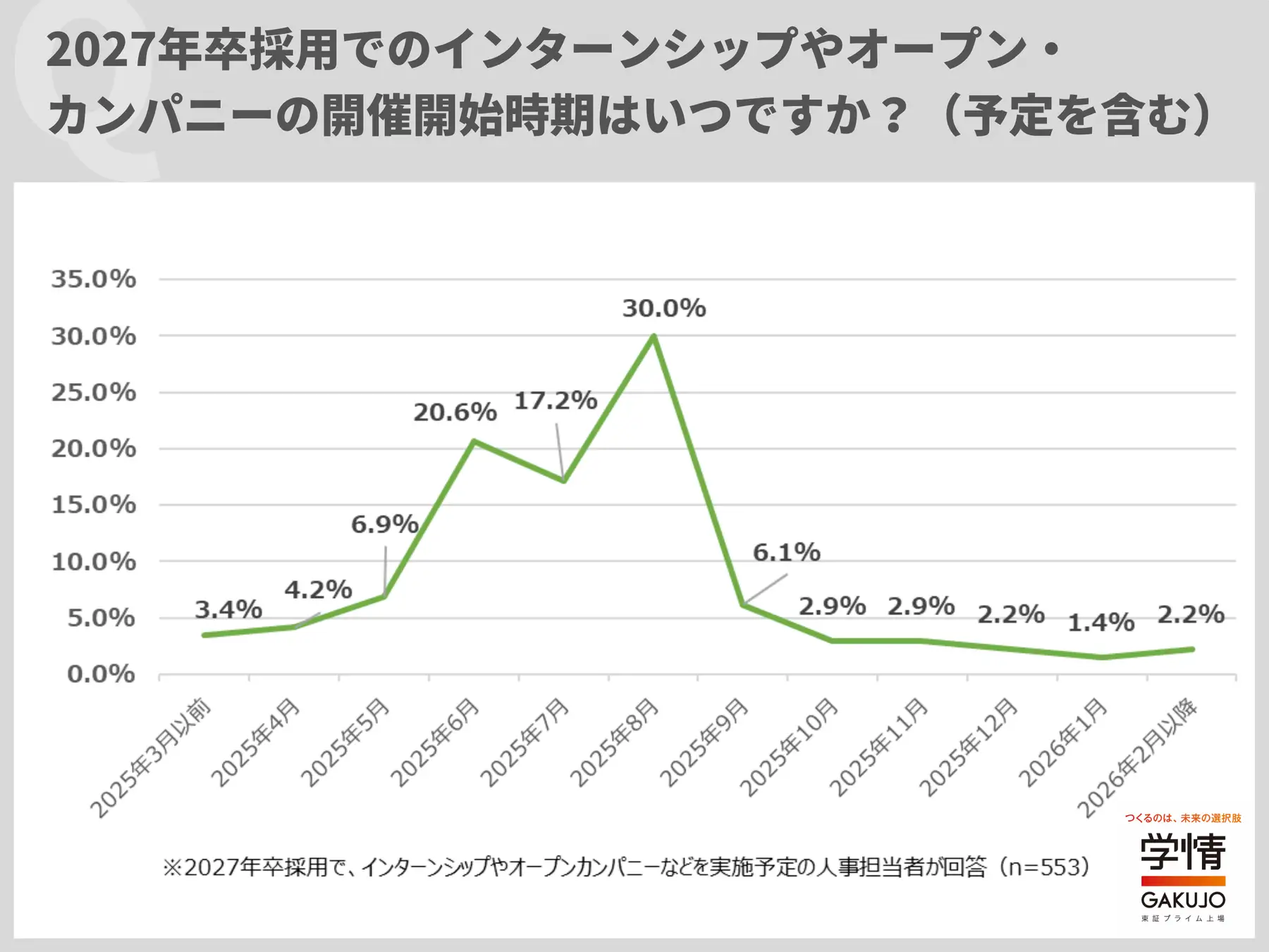 2027年卒採用でインターンシップやオープン・カンパニーを実施する企業に最初の開催時期(予定を含む)を尋ねたところ、「2025年8月」が最多で30.0%、次いで「同6月」20.6%、「同月」17.2%が続き、この3カ月で計67.8%を占めた。夏の3カ月に集中しており、同9月以降は一桁に急落する。同5月以前の開催も計14.5%あった。