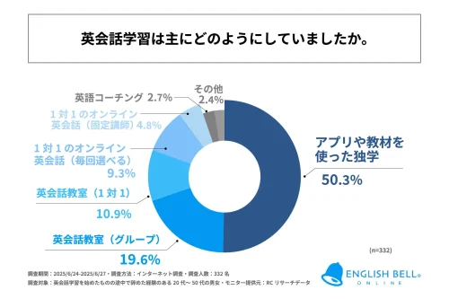 「英会話学習の主な方法」を尋ねる設問への回答では、1位が「アプリや教材を使った独学」50.3%、2位が「英会話教室(グループ)」19.6%、3位が「英会話教室(1対1)」10.9%の結果となった。