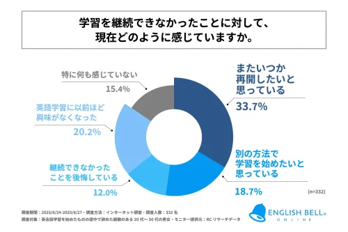 「学習を継続できなかったことに対して、現在どのように感じているか」を尋ねる設問への回答では、1位が「またいつか再開したいと思っている」33.7%、2位が「英語学習に以前ほど興味がなくなった」20.2%、3位が「別の方法で学習を始めたいと思っている」18.7%と続いた。1位と3位の回答を合計すると回答率50%を超えた。