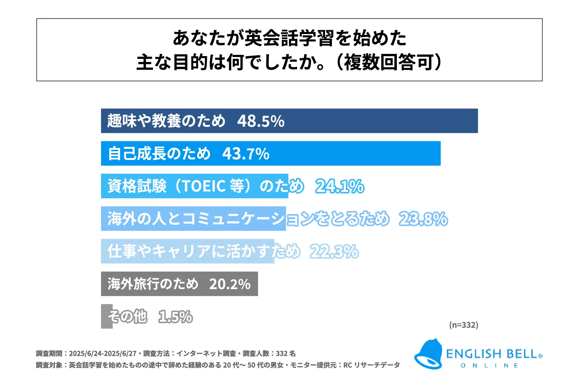 それによると、「英会話学習を始めた主な目的」を尋ねる設問への回答では、1位が「趣味や教養のため」48.5%、2位が「自己成長のため」43.7%、3位が「資格試験(TOEIC等)のため」24.1%と続いた。