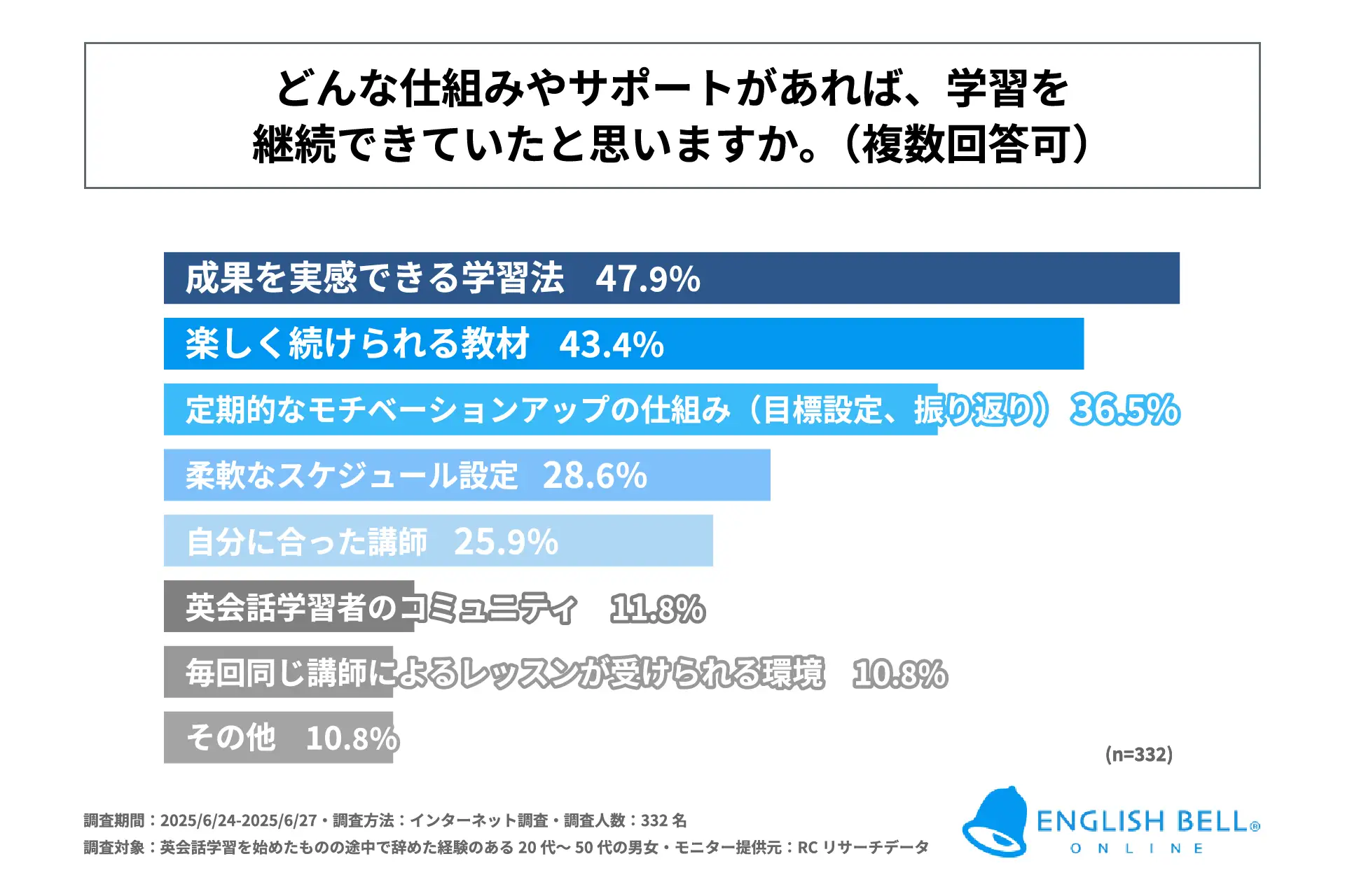 「どんな仕組みやサポートがあれば、学習を継続できていたと思うか」を尋ねる設問への回答では、1位が「成果を実感できる学習法」47.9%、2位が「楽しく続けられる教材」43.4%、3位が「定期的なモチベーションアップの仕組み(目標設定、振り返り)」36.5%の結果となった。