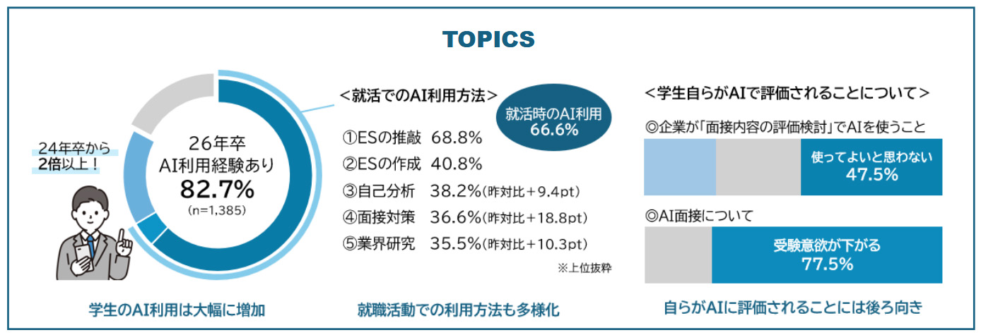 学生のAIの利用経験は26年卒で82.7%、2年前と比較して2倍以上。就職活動でのAI利用率も 26年卒では 66.6%で、3人に2人は就職活動にAIを利用し、24年卒(18.4%)と比較すると3倍以上増加した。