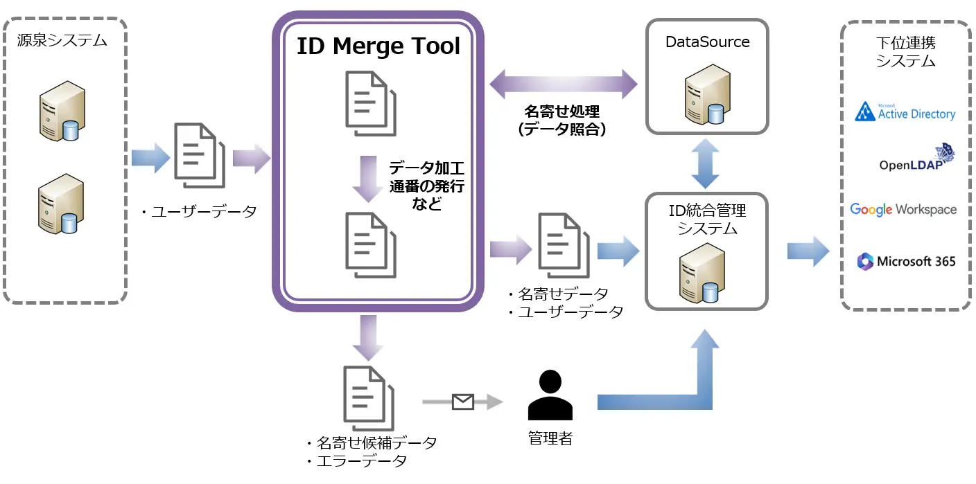 同ツールを利用し、各システムで保有する教職員や学生などのID情報を名寄せすることで、同一人物に対するIDの重複発行を防ぐことができる。同時に同一人物に割り当てられていると判定された複数のID情報を名寄せ対象候補として抽出することも可能。従来、手動で行っていたデータ移行作業も同ツールを利用することで既存IDへ情報がマージされるため作業工数を削減できる。