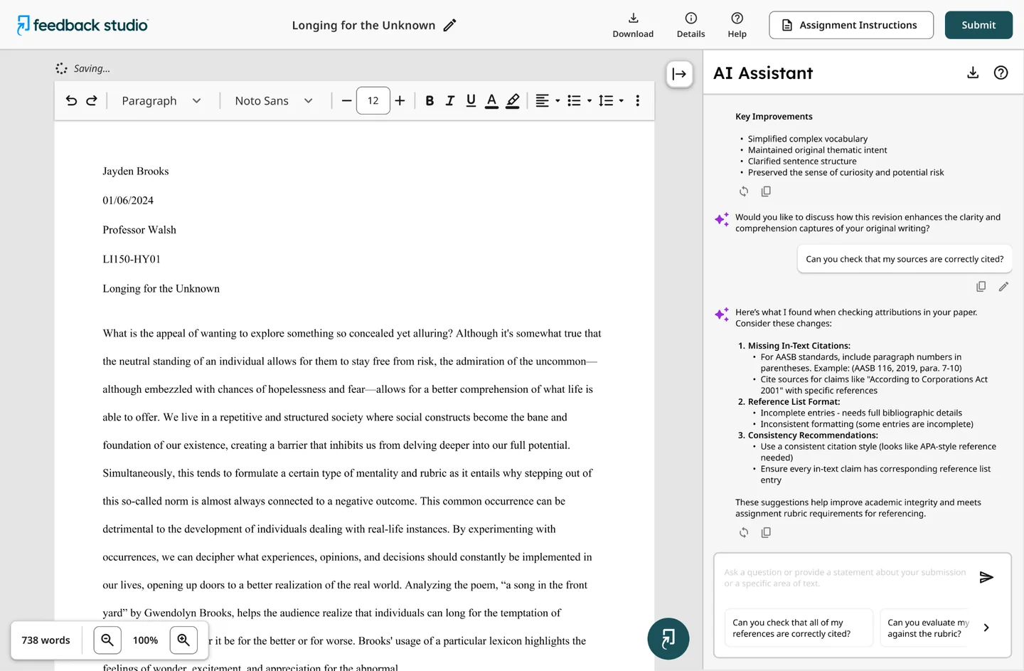 再構築されたTurnitin Feedback Studio(TFS)の有料アドオンとして提供され、Turnitin Clarityが学習環境にシームレスに統合されることにより、学生は任意のAIアシスタントを活用しながら、執筆・修正・振り返りを行える統合型の学習環境を利用できる。教育者は、学生がどのように文章を構成したかを示すデータやインサイトを活用して、インテグリティに基づいた文章作成を指導できるという。