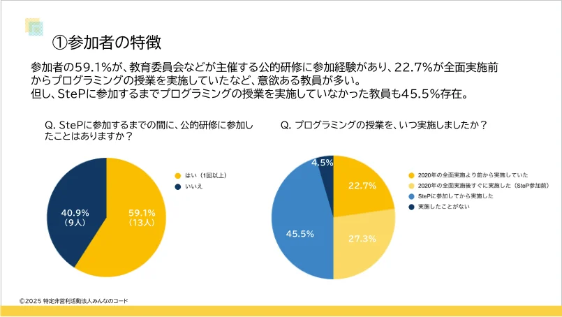 その結果、StePの参加者には、すでに公的研修に参加するなど、もともと意欲的な教員が多いことが判明。実際に、アンケート回答者の59.1%がStePに参加するまでの間に公的研修への参加経験があり、また、22.7%は2020年の全面実施前からプログラミング授業に取り組んでいた。
