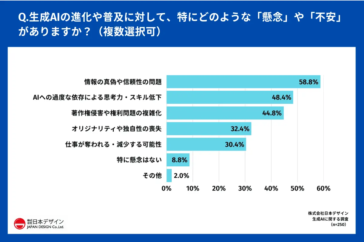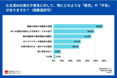 生成AIの進化や普及に対して「特にどのような懸念や不安があるか?」と質問したところ、58.8%が「情報の真偽や信頼性の問題」、48.4%が「AIへの過度な依存による思考力・スキル低下」と回答した。以下、「著作権侵害や権利問題の複雑化」44.8%、「オリジナリティや独自性の喪失」32.4%、「仕事が奪われる・減少する可能性」30.4%といった懸念も挙げられた。