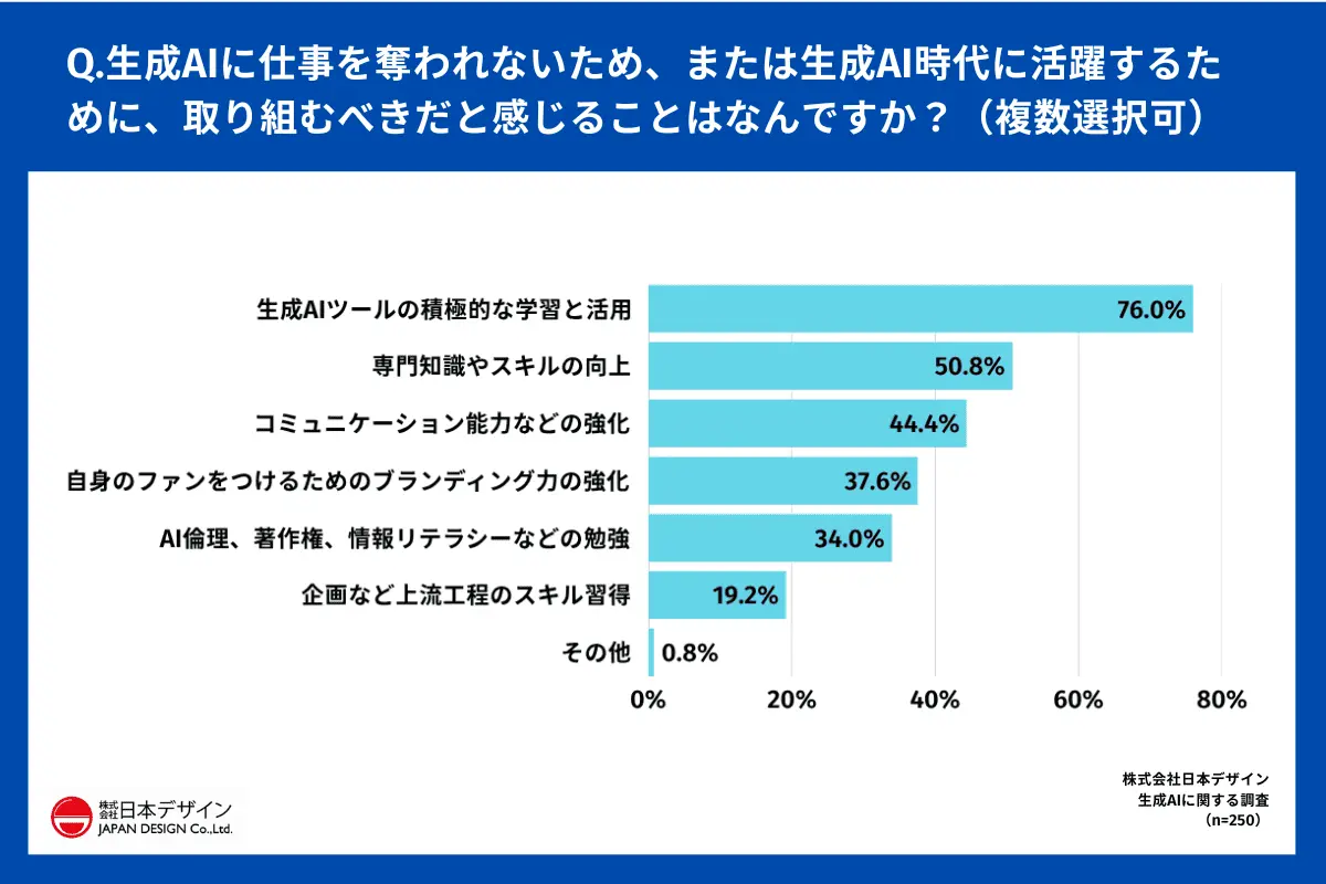 また、生成AIに仕事を奪われないため、または生成AI時代に活躍するために、「取り組むべきだと感じることは何か?」と質問したところ、76.0%が「生成AIツールの積極的な学習と活用」と回答。以下、「専門知識やスキルの向上」50.8%、「コミュニケーション能力などの強化」44.4%、「自身のファンをつけるためのブランディング力の強化」37.6%、「AI倫理、著作権、情報リテラシーなどの勉強」34.0%などが続いた。
