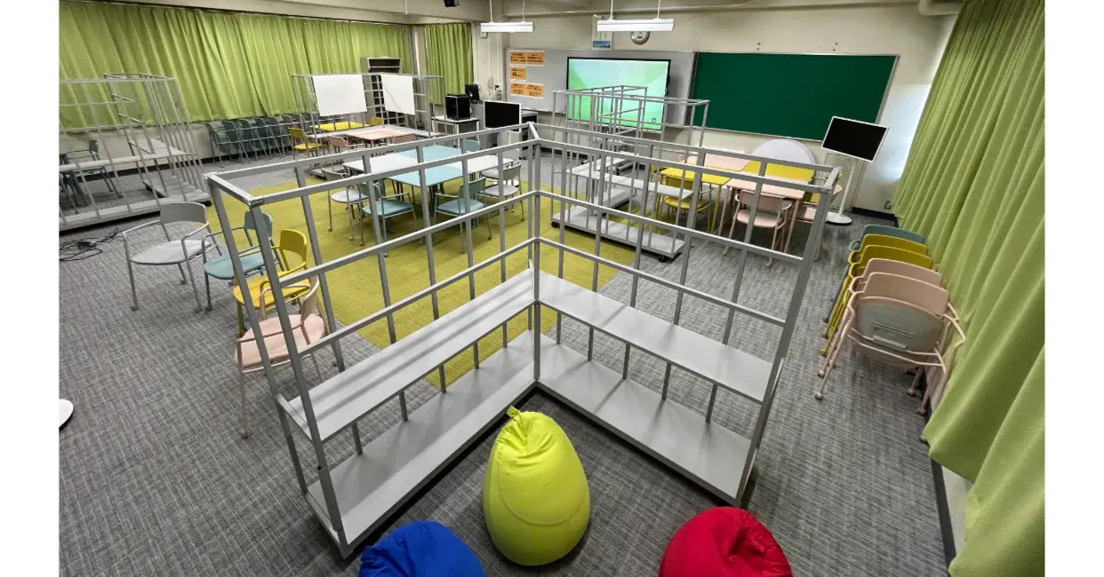 実証にあたり、同社と同小学校の教職員とでワークショップを開催し、PBL教室として必要な要素を抽出。同校の既存教室である「メディアルーム」(PC教室)に、新たに同社の家具商品(Any wayシリーズ)やICT機器(テクノホライゾン製の電子黒板・モバイルディスプレイ、Creality製高速3Dプリンタ、アバロンテクノロジーズ製ソフトウェア、Aver 製AI追尾カメラなど)を配置して、「わくわくラボ」(PBL教室)として整備した。