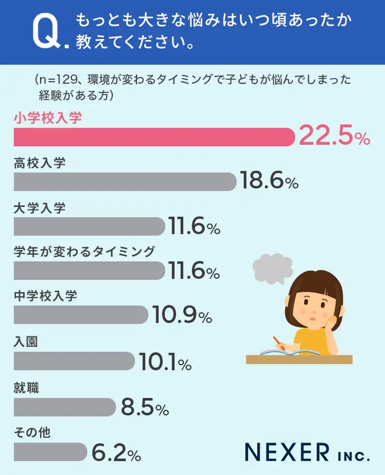 調査は青山ラジュボークリニック愛知提携院と共同で、事前調査で「子どもがいる」と回答した男女500名を対象に4月7日~22日に行われた。それによると、入園や入学、新学年や就職など環境の変わるタイミングで子どもが悩んでしまった経験が「ある」と回答した人は25.4%に上った。最も多かったのは「小学校入学」時で、あると回答した人の22.5%を占めた。