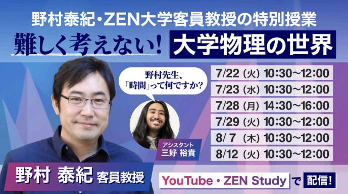 ZEN大学は、野村泰紀客員教授による特別授業「難しく考えない!大学物理の世界」を7月22日~8月12日にかけての6日間、実施する。