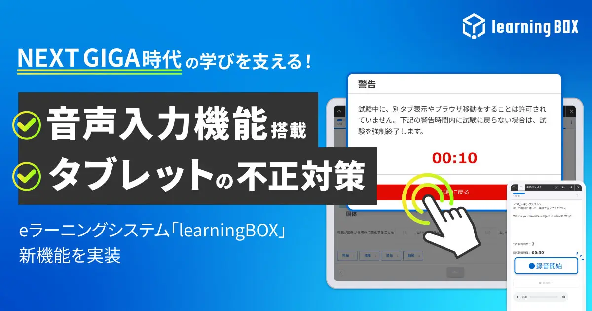learningBOXは23日、同社が開発・提供するeラーニングシステム「learningBOX」(ラーニングボックス)に、新たにスピーキング用の音声入力機能を搭載したほか、タブレットなどのタッチデバイスでの不正対策も強化した。