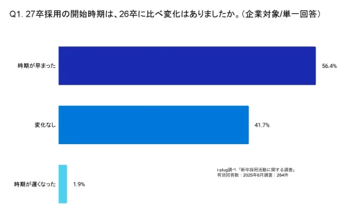 「27卒採用の開始時期」については、26卒に比べて「時期が早まった」と回答した企業は56.4%。半数以上の企業で採用活動の開始時期が早まっている。一方、26卒に比べて「時期が遅くなった」と回答した企業はわずか1.9%。