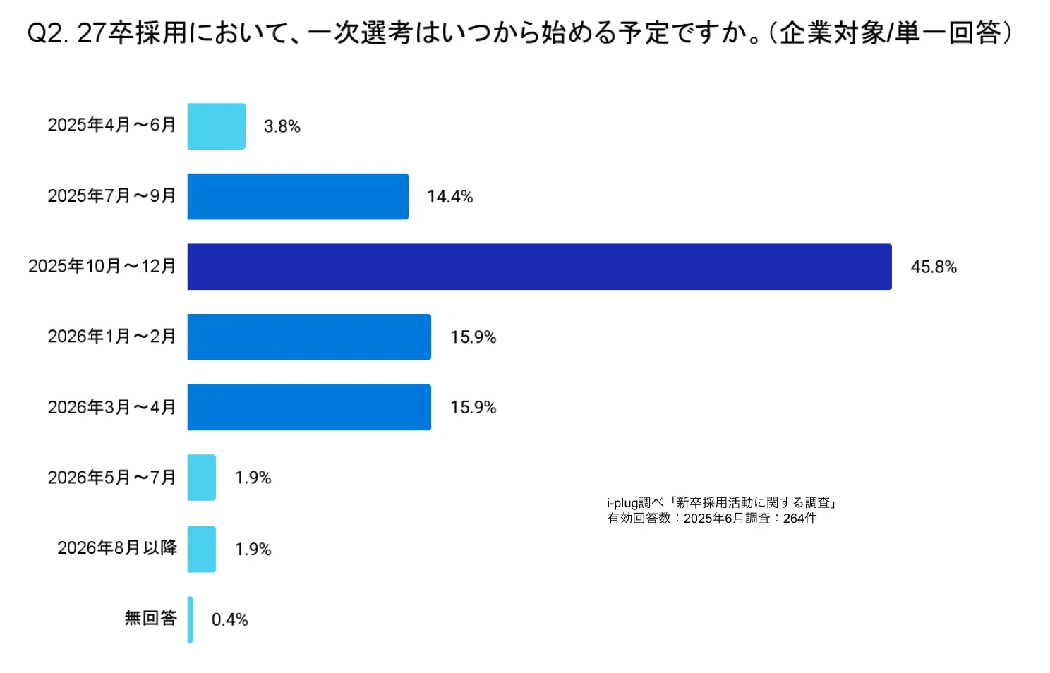 最終選考についても、一次選考と同じく、「2025年10月~12月」が最多の32.2%。全体の42.4%の企業が、2025年中に最終選考を開始する予定で、新卒採用の早期化の傾向が、最終選考にも及んでいる。