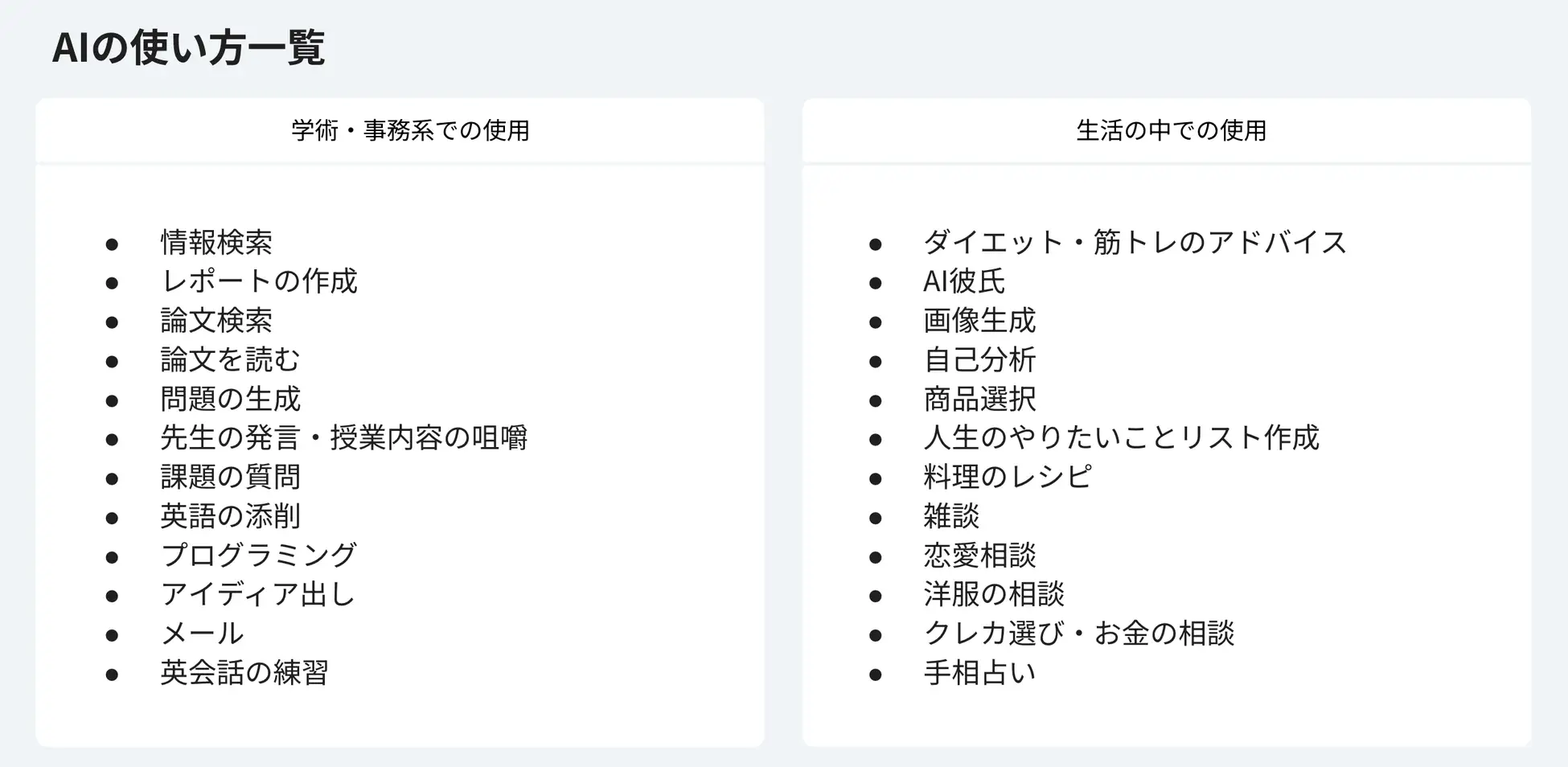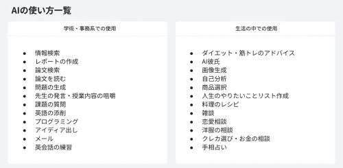 また、学業用途とは別に「AI彼氏」「恋愛相談」「人生のやりたいことリスト作成」「洋服選び」「お金の相談」など、まるで“デジタルの親友”のような使われ方が日常的に行われている実態も明らかになった。