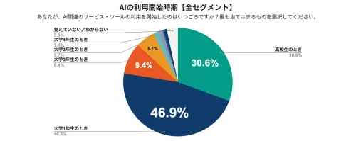 また、今回の調査によると、「AI関連サービスを使い始めたのは大学1年時」と回答した学生が最も多く全体の46.9%を占めたが、それに次いで多かったのが「高校時代から利用していた」30.6%で、すでに約3人に1人が「高校生AIユーザー」として大学に入学している計算になる。