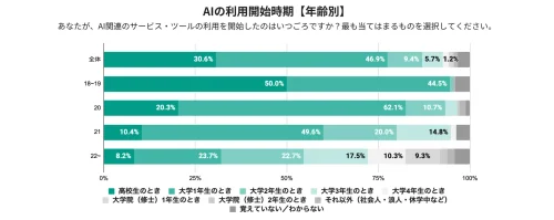 年齢別に見ると、現在18〜19歳の学生のうち半数が「高校生のときにAIを使い始めた」と回答しており、Z世代・α世代を中心に「生成AIネイティブ世代」が出現し始めていることが明らかになった。