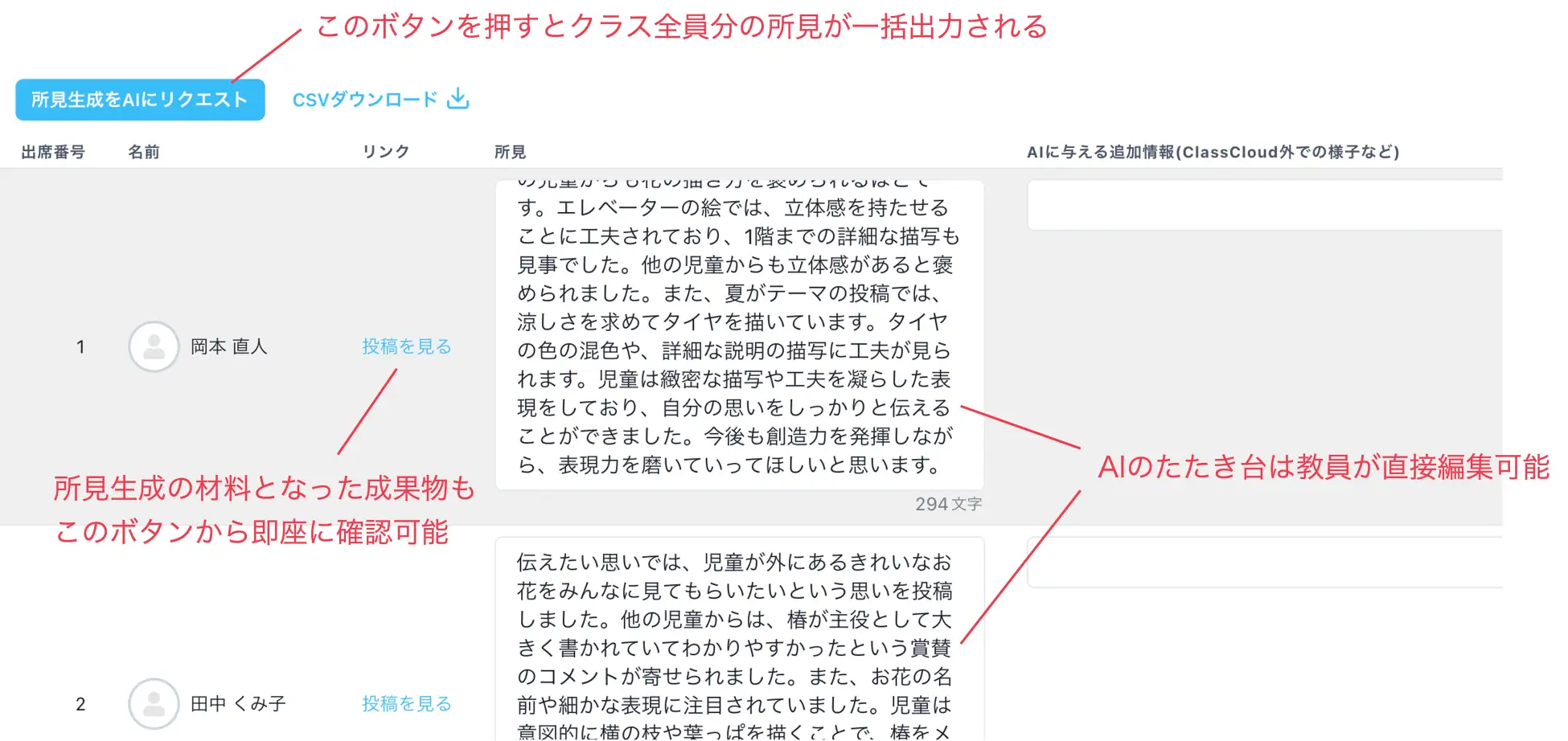 具体的には、ワンタップでClassCloud上の成果物をもとにクラス全員分の所見が生成され、教員がその所見を一覧画面で効率的に編集できる機能を搭載。所見の材料となった子どもの成果物もすぐに見ることができ、教員が根拠を辿りながら、責任を持って所見を作り切ることができる。「教員の負担軽減」「所見の質の向上」「教員の見取りの向上」といった効果が期待できる。