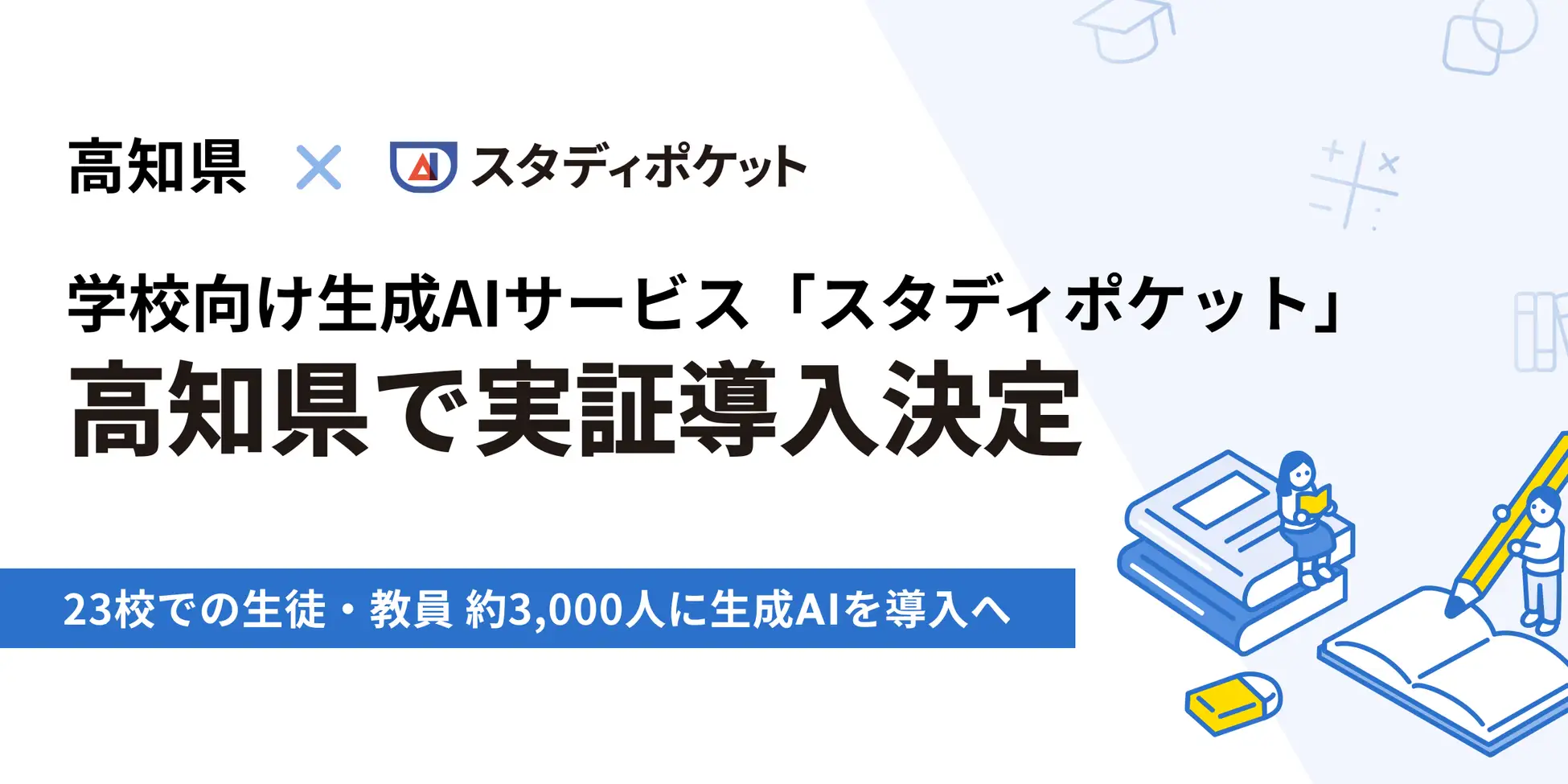 スタディポケットは29日、高知県教育委員会が主導する「AI学習支援アプリ導入促進事業委託業務」のもと、県内23校の公立中学校生徒2623人と教職員364人を対象に、学校向け生成AIクラウド「スタディポケット」が導入されることが決定し、6月から423校全校でサービス運用を開始したことを発表した。
