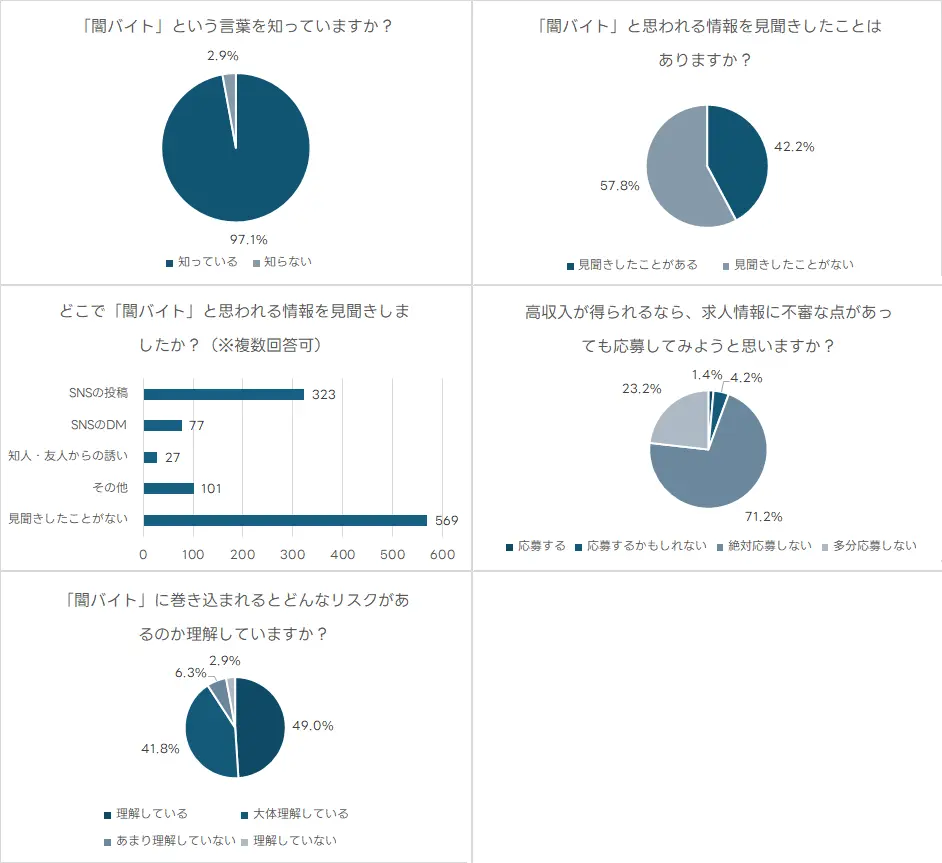 それによると、「闇バイト」という言葉を知っている10~20代は97%に上り、多くの若者に浸透していることが分った。また、「闇バイトと思われる情報」を見かけたことがあるのは全体の42%で、「闇バイト」情報の広がりを示す結果となった。