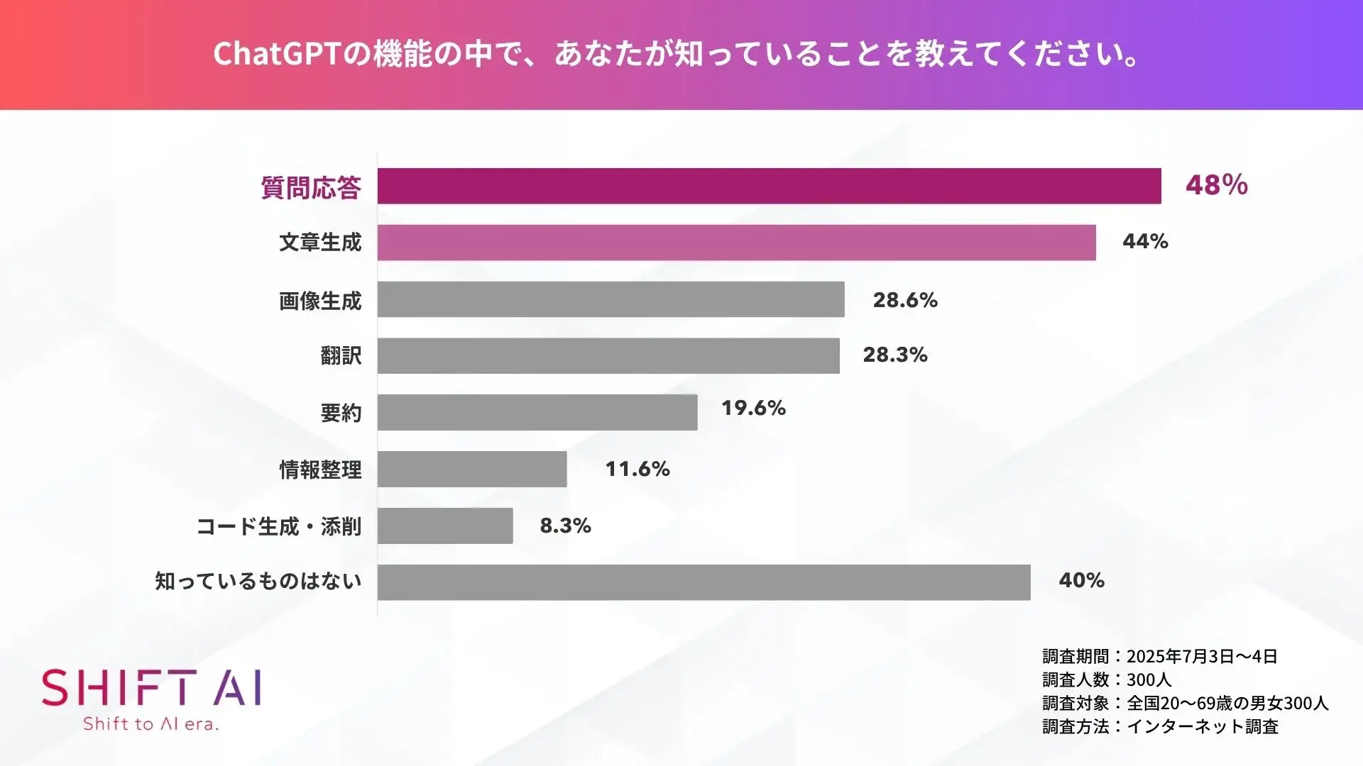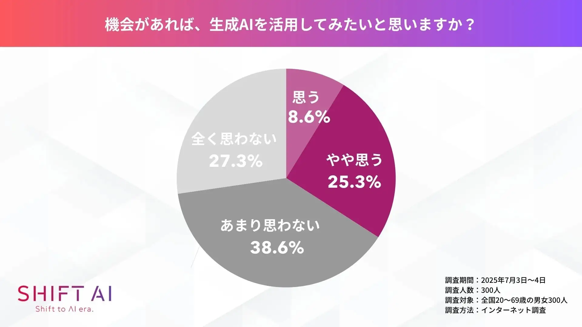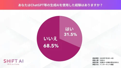 SHIFT AIは7月30日、全国の男女20~69歳の3000名を対象に実施した、ChatGPTなどの生成AIの活用に関する意識調査の結果を発表した。