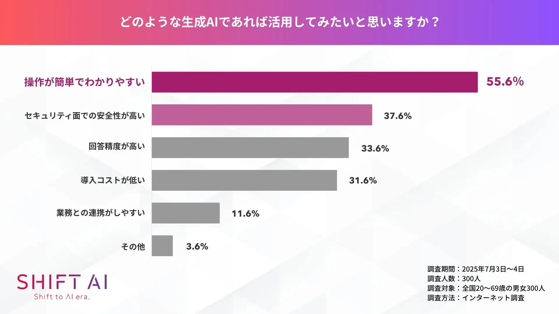 設問1で生成AIを使用した経験が「ない」と回答したうちの300人に対して、どのような生成AIであれば活用してみたいかを聞いたところ、「操作が簡単でわかりやすい(55.6%)」が最多、導入のしやすさや学習コストの低さが求められていることが分かる。