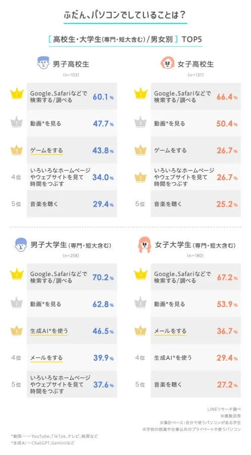 普段パソコンでしていることは、高校生・大学生ともに「検索」がトップ、次いで「動画を見る」が続いた。また男子大学生は「生成AIを使う」が高めの結果となった。