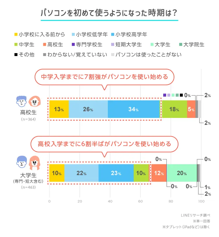 調査は15~25歳の学生を対象に6月20日~23日に行われ、827名から有効回答を得た。それによると、パソコンを使い始めた時期は、高校生は「中学入学前まで」が7割強、大学生は「高校入学前まで」が6割半ばを占めた。