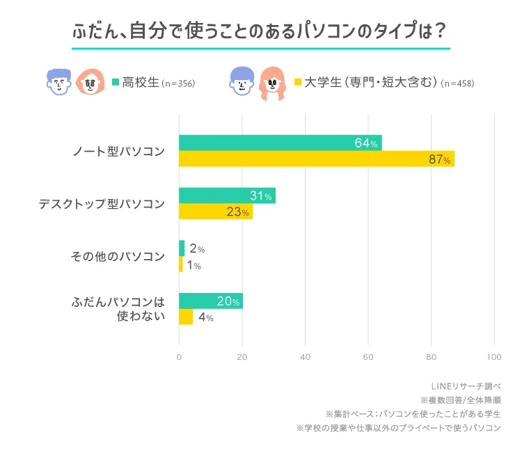 「ノート型パソコン」や「デスクトップ型パソコン」は、男子高校生の割合が女子高校生より高く、女子高校生では「ふだんパソコンは使わない」の割合が2割台半ばと高めだった。