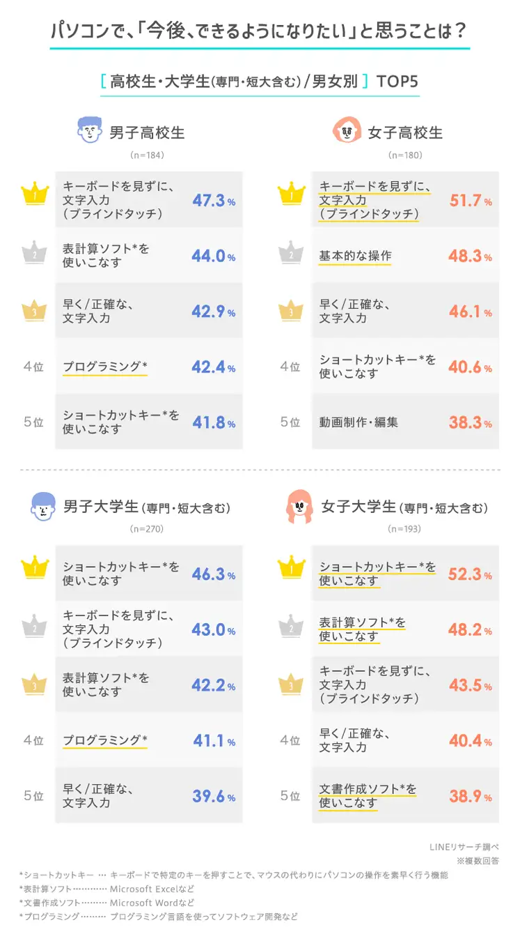 今後パソコンでできるようになりたいことを訊ねたところ、高校生は「キーボードを見ずに文字入力」、大学生は「ショートカットキーを使いこなす」がトップとなり、男子は高校生・大学生ともに「プログラミング」への関心が高めとなった。