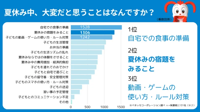 それによると、保護者の夏休みの2大悩みは「食事の準備」と「宿題」。最もたいへんだと思う宿題を訊いたところ、子どもも保護者もともに「自由研究・工作」がトップで、「読書感想文」があとに続いた。