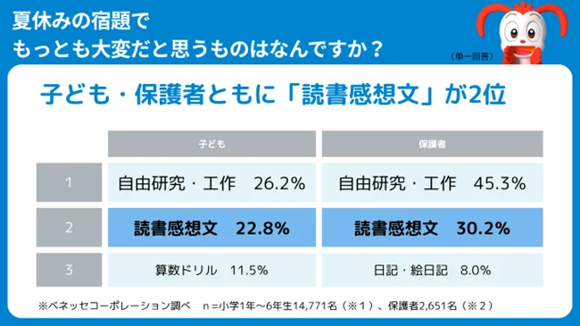 ベネッセコーポレーションが提供する通信教育講座「進研ゼミ小学講座」は5日、小学生の夏休みの宿題に関する調査結果(読書感想文編)を公表した。