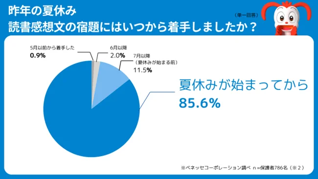 読書感想文に実際に着手するのは「夏休みが始まってから」が85.6%、休み前から準備をする人は14.4%に上った。