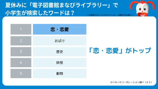 一方で、進研ゼミ小学講座が提供する電子書籍サービス「電子図書館まなびライブラリー」で昨年の夏休み期間に子どもが読みたい本を探すために使用した「検索ワード」では、「恋」が堂々の第1位となっており、毎年同じ傾向にあるという。