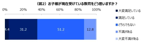 「子どもが現在受けている教育をどう思うか?」と尋ねたところ、51.2%の親が、子どもに必要な教育に関する具体的なイメージを持てずに、満足とも不満とも評価できない「どちらでもない」と回答。「大変満足している」、「満足している」と答えたのは35.6%で、「どちらでもない」を下回り、日本の教育制度を好評価できない傾向が伺えた。