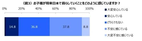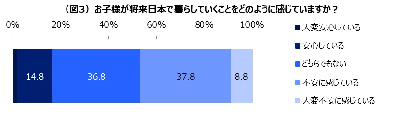 「子どもが将来日本で暮らすことをどう思うか?」との質問には、46.6%の親が「不安に感じている」、「大変不安に感じている」と回答し、「大変安心している」、「安心している」の16.6%を大きく上回った。