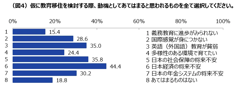 「教育移住をするとしたら、どんなことが動機になるか?」と聞いたところ、44.4%の親が「日本経済の将来不安」と回答し、「日本の社会保障の将来不安」35.8%が次点だった。教育移住でより良い教育環境を与えることが、子どもが将来直面するであろう日本の経済に起因する不安を解消できる手段の1つとして認識されていることが示された。