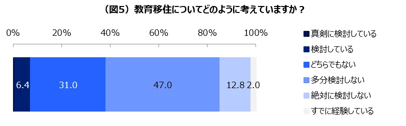 また、実際に教育移住を「真剣に検討している」、「検討している」と回答した親は7.2%にとどまったのに対し、「多分検討しない」、「絶対に検討しない」は59.8%と大きく上回る結果となった。