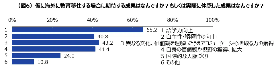 最後に、「教育移住で期待する成果」について聞いたところ、最も多かったのは「語学力向上」65.2%で、日本で習得できる外国語教育への不満が結びついた結果となった。性別でみると、「男性」67.0%、「女性」61.4%と、男性がより語学力を重視する割合が高く、目に見えるスキルを重視している傾向が見られた。
