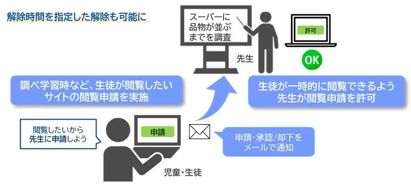 今回アップデートした規制解除申請機能の活用で、児童・生徒が授業中にWebサイト閲覧を申請したものについて、メール通知を受け取った教員がその場で判定し、「授業時間中のみ」など時間単位で規制を解除できるようになった。