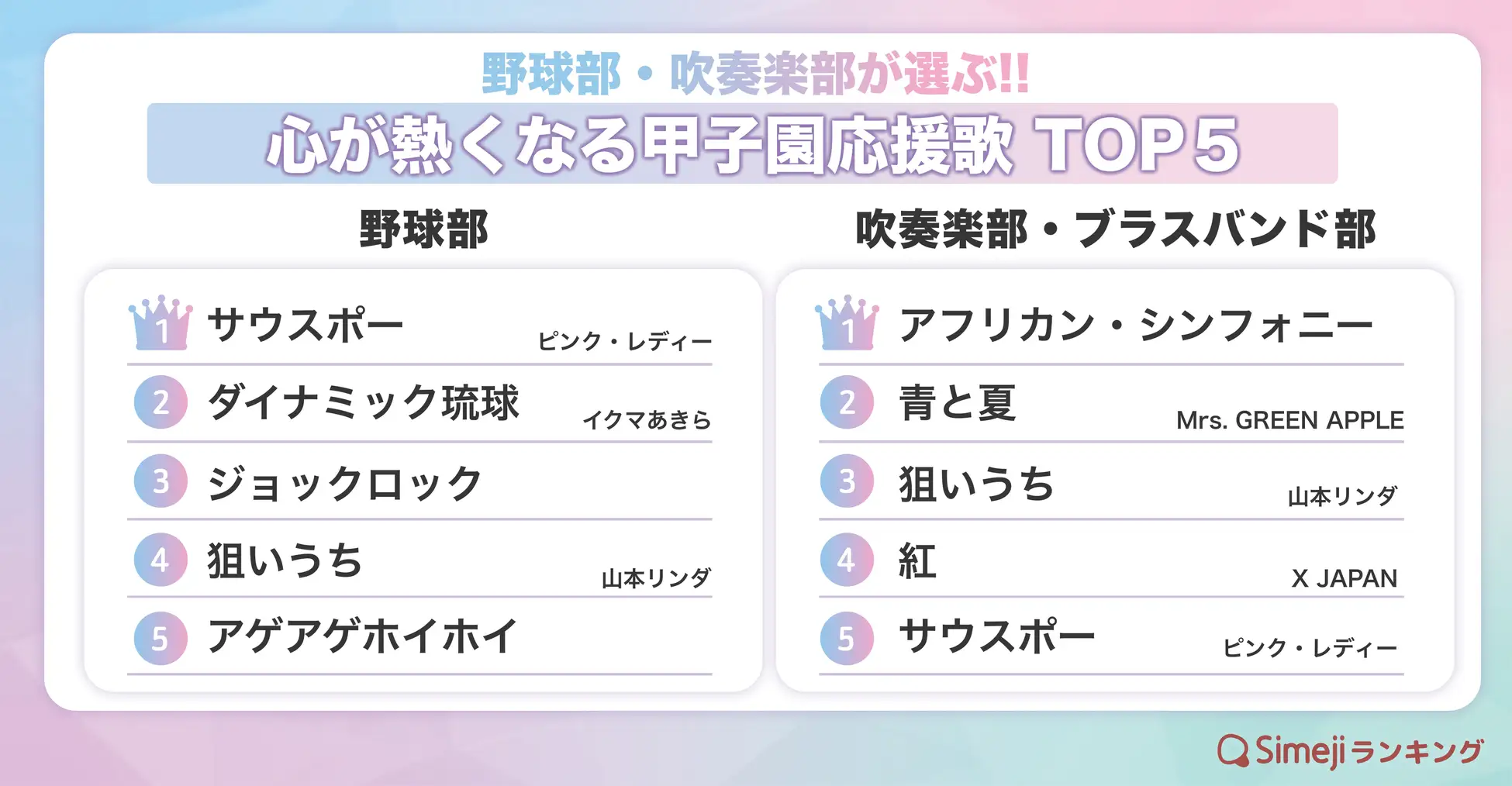 一方、「心が熱くなる応援曲TOP5」は、「野球部編」では、第1位「サウスポー」(ピンクレディー)、第2位「ダイナミック琉球」(イクマあきら)、第3位「ジョックロック」、第4位「狙いうち」(山本リンダ)、第5位「アゲアゲホイホイ」という順位。