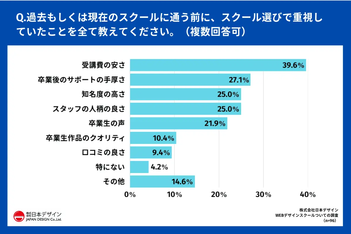 「スクール選びで重視していたことを教えてください。(複数回答可)」の質問には、「受講費の安さ」が39.6%で最多回答。