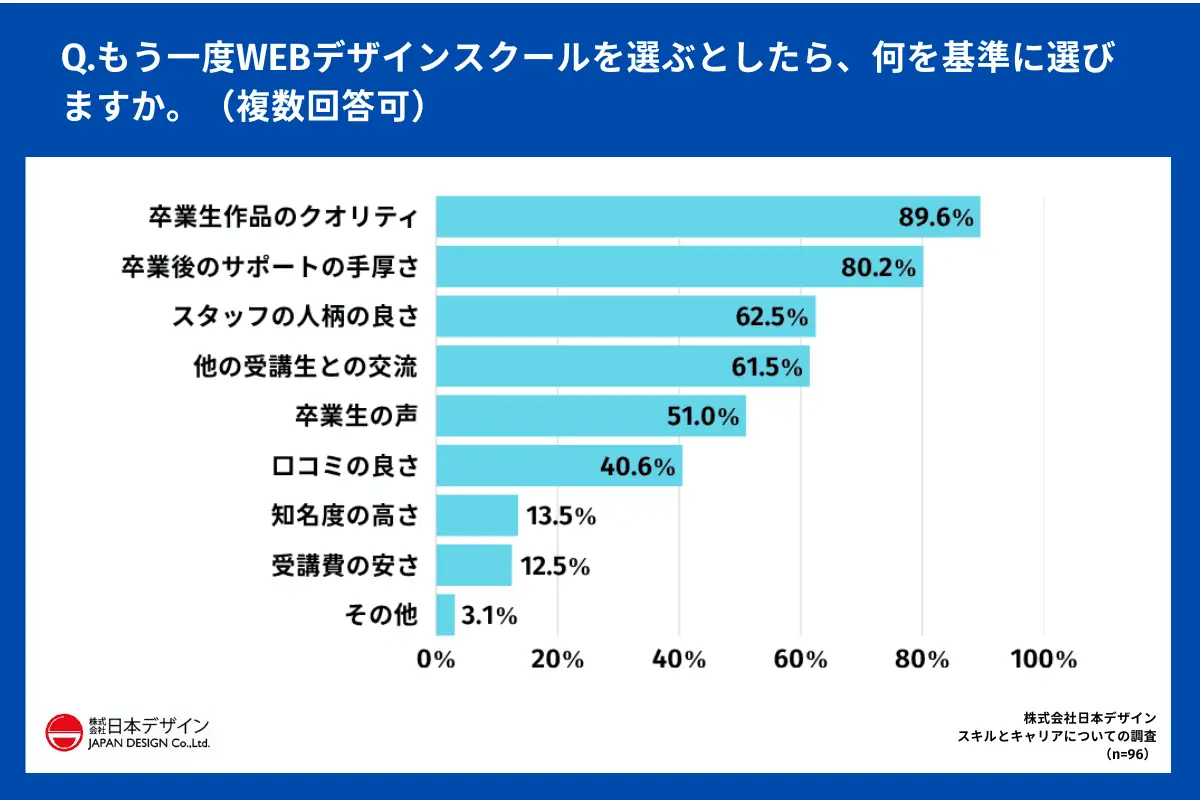「もう一度WEBデザインスクールを選ぶとしたら、何を基準に選びますか。(複数回答可)」の質問には、「卒業生作品のクオリティ」が89.6%、「卒業後のサポートの手厚さ」が80.2%だった。