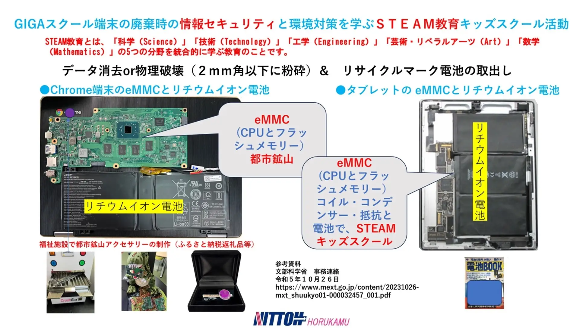 GIGAスクール構想で配布されたタブレット端末は、2025年度以降、更新時期を迎え、個人情報が含まれるeMMC(組み込み型マルチメディアカード)やリチウムイオン電池の適切な処理が喫緊の課題となっているが、同社のオンサイトBPOサービスは、最大10台のタブレット分解装置を活用して、顧客の現場(オンサイト)で迅速な処理を行う。