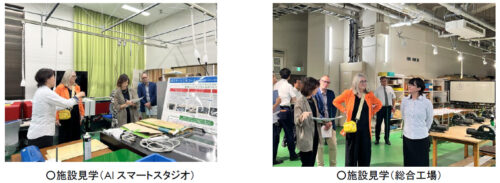 その後、2025年度に再編された電気電子エネルギー工学コース担当教員の研究室、機械部品加工を行う総合工場、コンピュータによる実践的なものづくりを行うAIスマートスタジオ(AIスマート工学コース)等の同校施設を案内した。